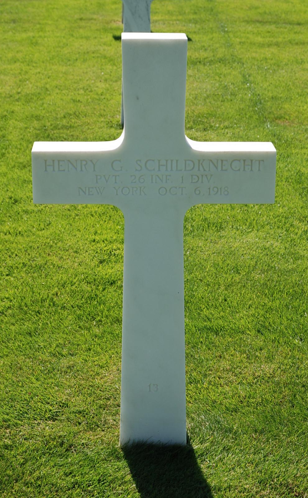 When Henry G. Schildknecht was born in April 1892, his father, Henry, was 34 and his mother, Mary, was 28. He entered the military service in New York and served in the U.S. Army during World War I as a Private in Company D, 26th Infantry Regiment, 1st Infantry Division. He was Killed in Action on October 6, 1918 and is now buried in Meuse-Argonne American Cemetery and Memorial, Romagne-sous-Montfaucon, Departement de la Meuse, Lorraine, France. His name is commemorated on the First Infantry Division monument in Saint-Juvin, France but his surname is inscribed as Shildknecht.