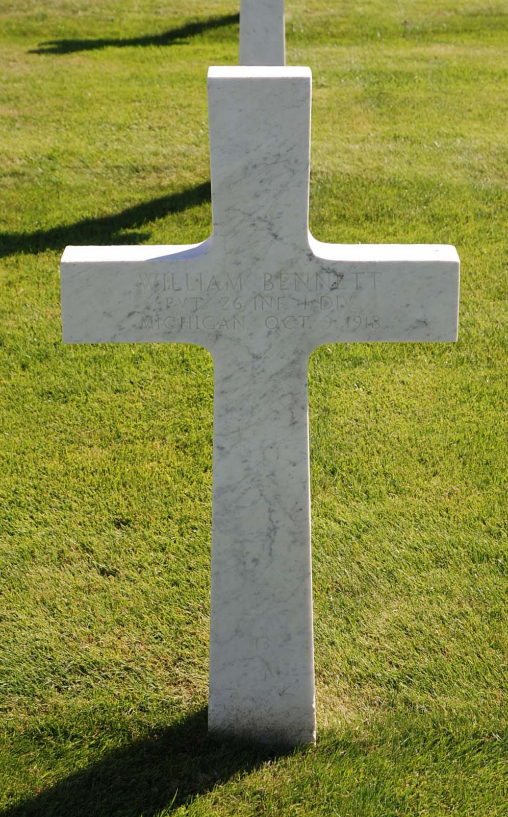 William Bennett entered the military service in Michigan. He served in the U.S. Army during World War I as a Private in Company E, 26th Infantry Regiment, 1st Infantry Division. He died from his wounds received in battle on October 9, 1918 and is now buried in Meuse-Argonne American Cemetery and Memorial, Romagne-sous-Montfaucon, Departement de la Meuse, Lorraine, France.