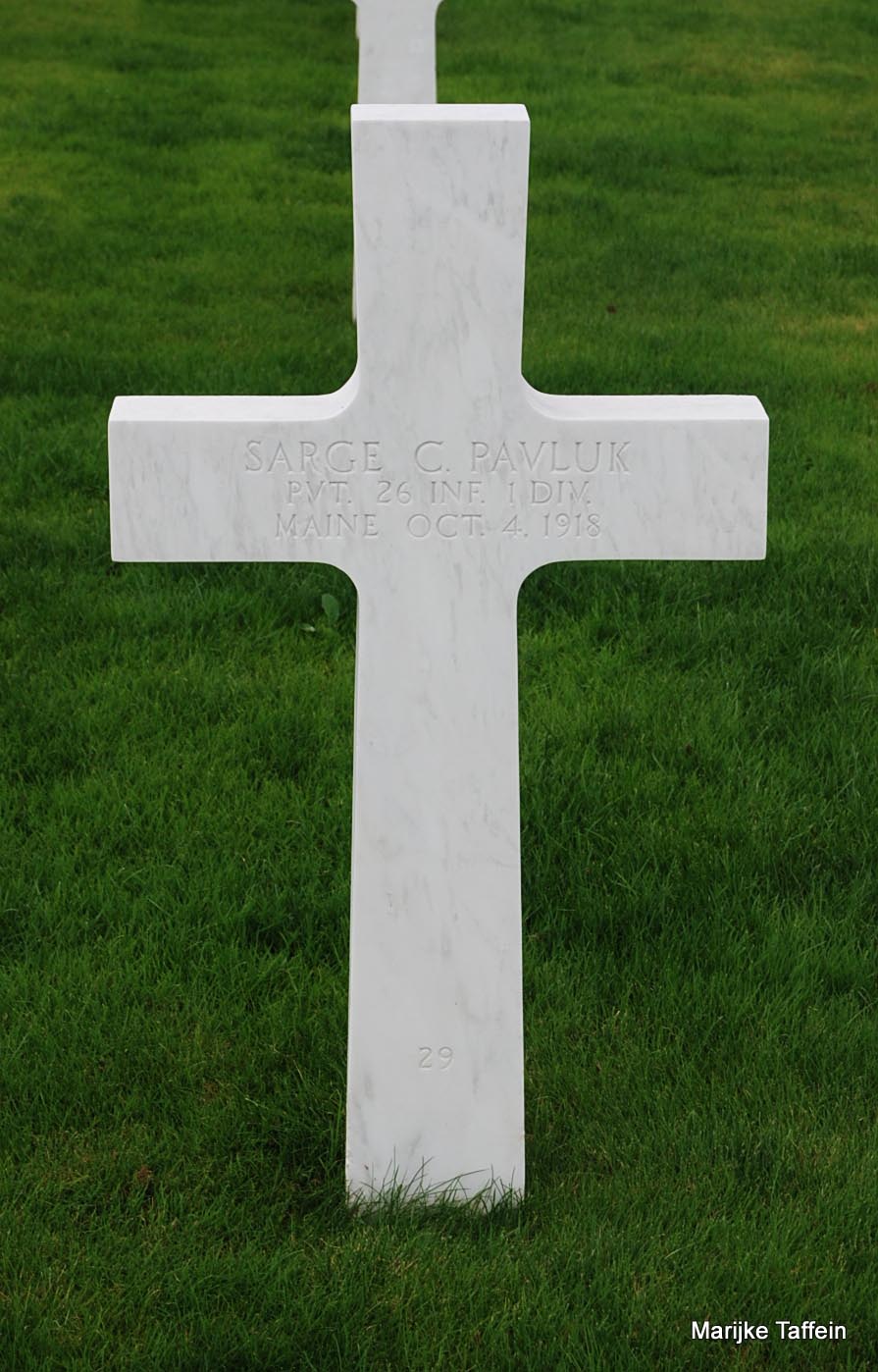Serge C. Pavluk entered the military service in Maine. He served in the U.S. Army during World War I as a Private in Company E, 26th Infantry Regiment, 1st Infantry Division. He was Killed in Action on October 4, 1918 and is now buried in Meuse-Argonne American Cemetery and Memorial, Romagne-sous-Montfaucon, Departement de la Meuse, Lorraine, France.