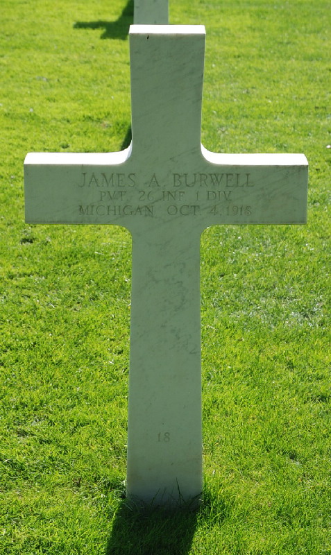 James A. Burwell was born on January 24, 1899 in Byron Center, Kent County, Michigan. He entered the military service in Michigan soon after war was declared. He served in the U.S. Army during World War I as a Private in Company I, 26th Infantry Regiment, 1st Infantry Division. He died from his wounds received in battle on October 4, 1918 and is now buried in Meuse-Argonne American Cemetery and Memorial, Romagne-sous-Montfaucon, Departement de la Meuse, Lorraine, France.