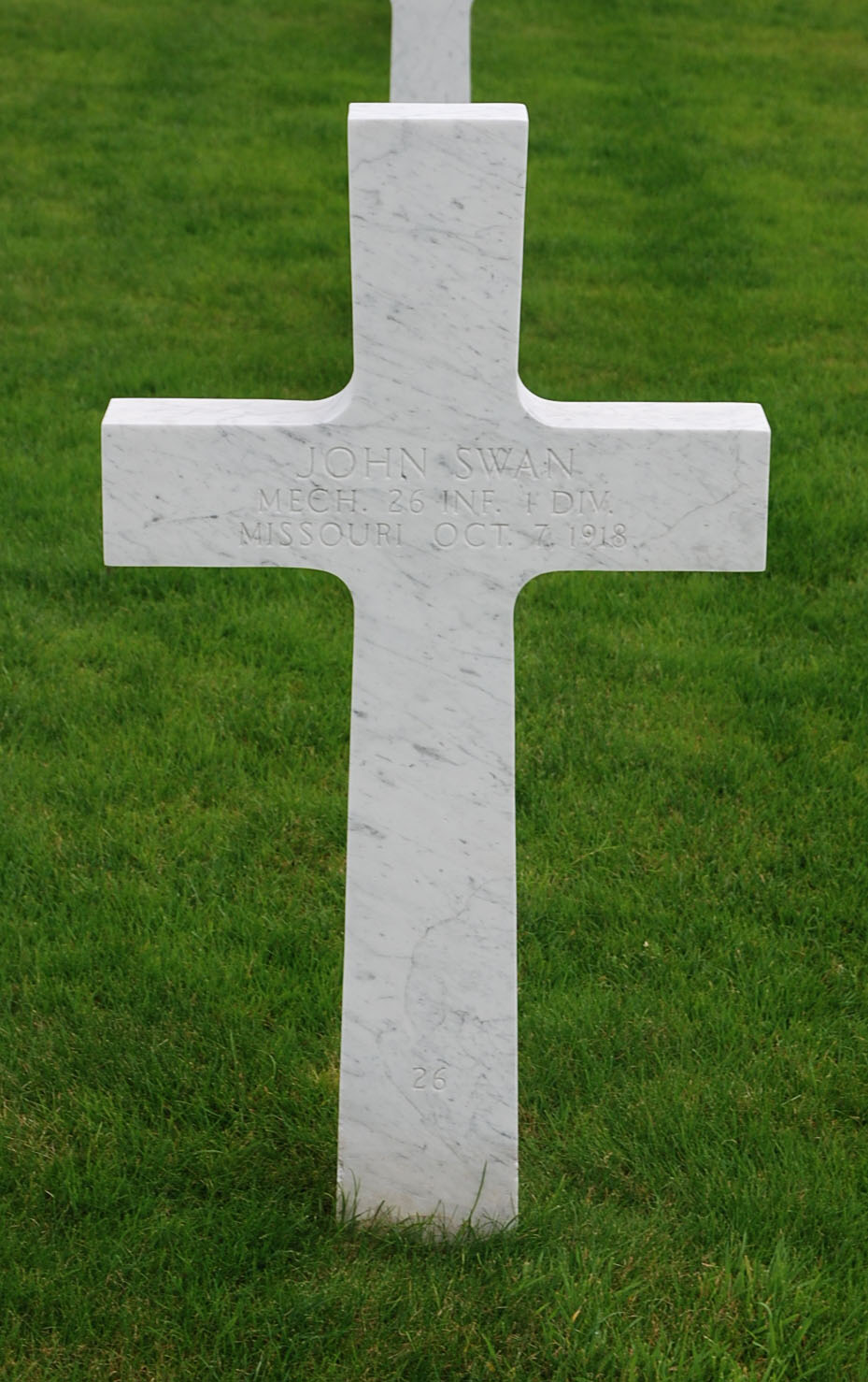 John Swan entered the military service in Missouri. He served in the U.S. Army during World War I as a Mechanic in Company K, 26th Infantry Regiment, 1st Infantry Division. He died from his wounds received in battle on October 7, 1918 and is now buried in Meuse-Argonne American Cemetery and Memorial, Romagne-sous-Montfaucon, Departement de la Meuse, Lorraine, France.
