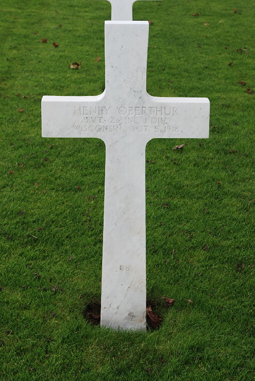 Henry Oberthur entered the military service in Wisconsin. He served in the U.S. Army during World War I as a Private in Company L, 26th Infantry Regiment, 1st Infantry Division. He was Killed in Action on October 5, 1918 and is now buried in Meuse-Argonne American Cemetery and Memorial, Romagne-sous-Montfaucon, Departement de la Meuse, Lorraine, France.