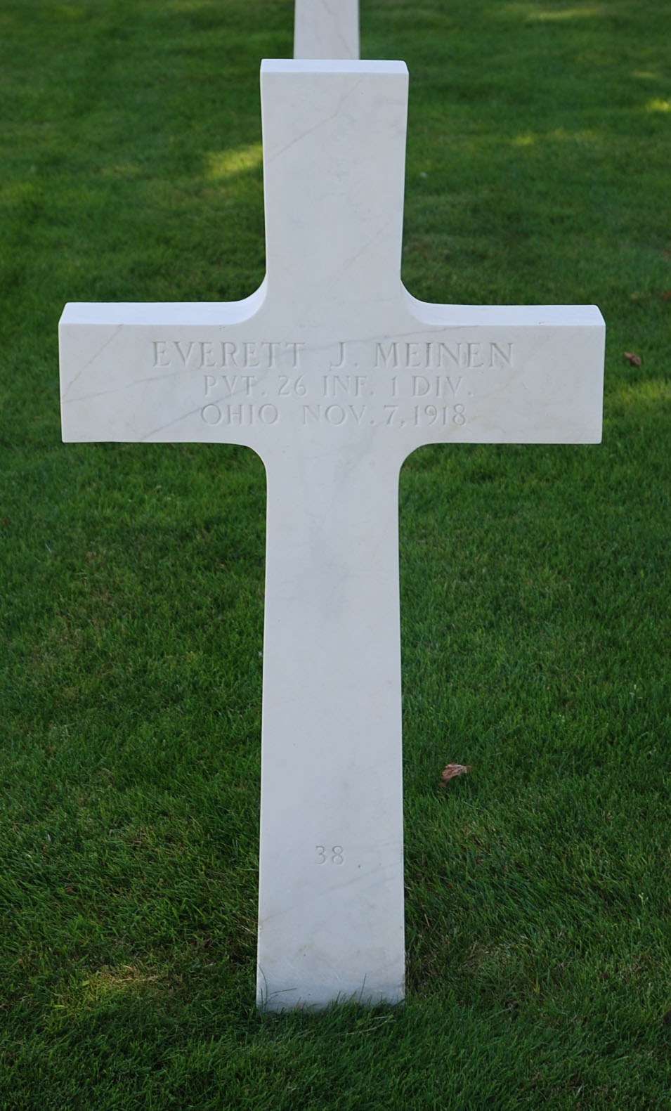 When Everett J. Meinen was born on October 23, 1893, in Ohio, his father, Hans, was 38 and his mother, Johanna, was 26. He had one brother and four sisters. He served in the U.S. Army during World War I as a Private in HQ Company, 26th Infantry Regiment, 1st Infantry Division. He was Killed in Action on November 7, 1918 and is now buried in Meuse-Argonne American Cemetery and Memorial, Romagne-sous-Montfaucon, Departement de la Meuse, Lorraine, France. He also has a marker in . Toledo Memorial Park, Sylvania, Lucas County, Ohio, USA.
