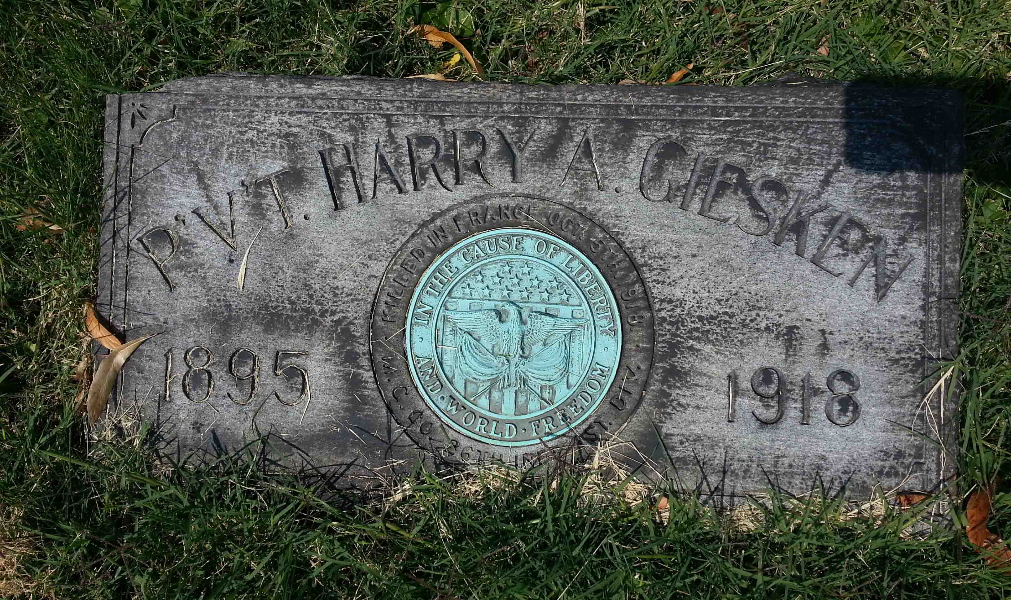 Harry A. Giesken was born in 1895. He served in the U.S. Army during World War I as a Private in Machine Gun Company, 26th Infantry Regiment, 1st Infantry Division. He was Killed in Action on October 5, 1918 and is now buried in Saint Mary Cemetery, Saint Bernard, Hamilton County, Ohio, USA. His name is commemorated on the First Infantry Division monument in Saint-Juvin, France but his surname is inscribed as Gieskin and ranked as a Private First Class.