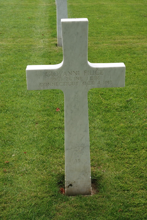 Giovanni Filice was born in 1894 in Rogliano, Provincia di Cosenza, Calabria, Italy. He entered the military service in Connecticut and served in the U.S. Army during World War I as a Private in Machine Gun Company, 26th Infantry Regiment, 1st Infantry Division. He was Killed in Action on October 4, 1918 and is now buried in Meuse-Argonne American Cemetery and Memorial, Romagne-sous-Montfaucon, Departement de la Meuse, Lorraine, France. His name is also listed on the Veteran War Memorial in Canton, CT.