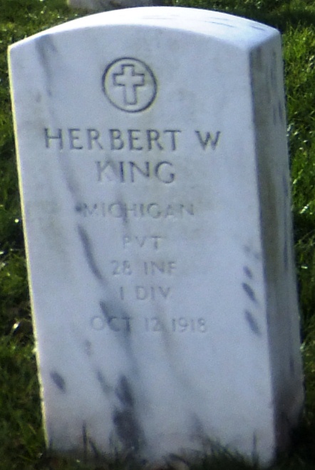 Herbert W. King served in the U.S. Army during World War I as a Private in Company B, 28th Infantry Regiment, 1st Infantry Division. He was Killed in Action on October 12, 1918 and is now buried in Arlington National Cemetery, Arlington, Arlington County, Virginia, USA.