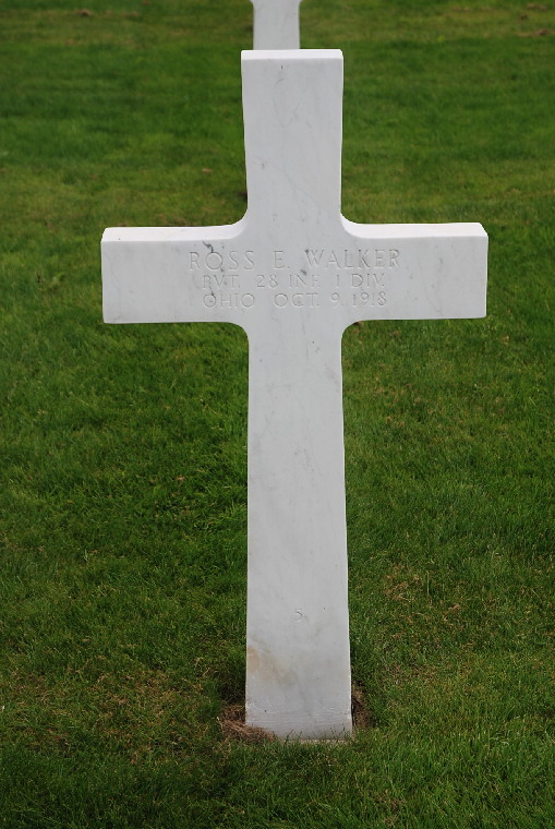 Ross E. Walker entered the military service in Ohio. He served in the U.S. Army during World War I as a Private in Company D, 28th Infantry Regiment, 1st Infantry Division. He was Killed in Action on October 9, 1918 and is now buried in Meuse-Argonne American Cemetery and Memorial, Romagne-sous-Montfaucon, Departement de la Meuse, Lorraine, France.