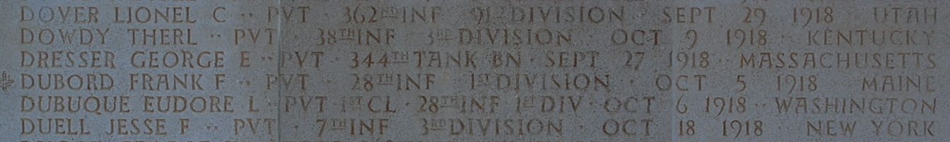 Frank Faithful Dubord was born on December 8, 1892 in Lewiston Junction, Androscoggin County, Maine. He served in the U.S. Army during World War I as a Private in Company E, 28th Infantry Regiment, 1st Infantry Division. He was Killed in Action but declared "Missing" on October 5, 1918 and is memorialized on Tablets of the Missing, Meuse-Argonne American Cemetery and Memorial, Romagne-sous-Montfaucon, Departement de la Meuse, Lorraine, France. His name is commemorated on the First Infantry Division monument in Saint-Juvin, France but his surname is inscribed as Duboid. He was awarded the Distinguished Service Cross posthumously and cited as follows: