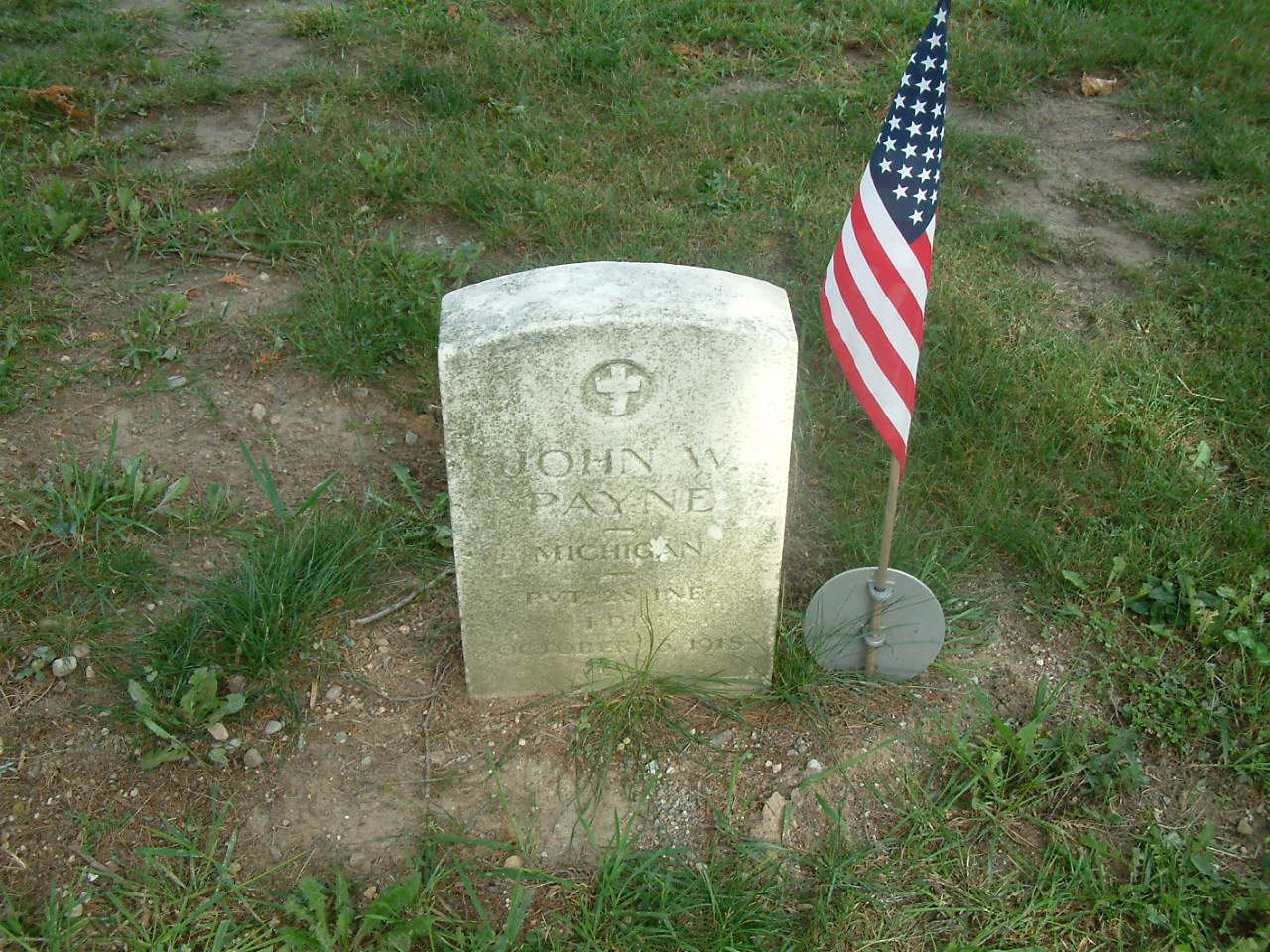 When John Wesley Payne was born on February 4, 1892, in Elsie, Michigan, his father, William, was 47 and his mother, Mary, was 39. He served in the U.S. Army during World War I as a Private in Company H, 28th Infantry Regiment, 1st Infantry Division. He was Killed in Action on October 5, 1918 at the age of 26 and is now buried in Riverside Cemetery, Elsie, Clinton County, Michigan, USA.