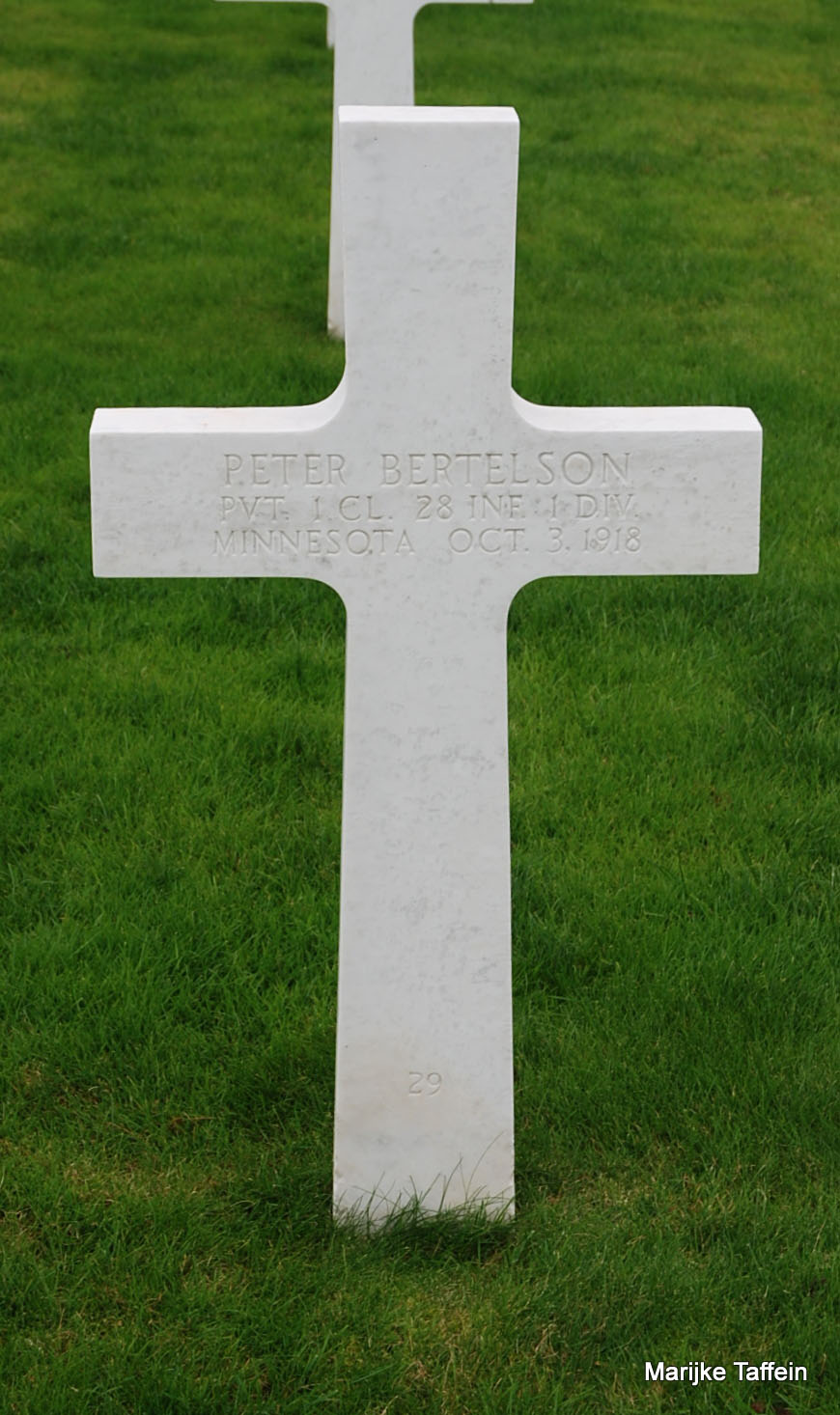 Peter Bertelson was born on April 24, 1888 in Minneapolis, Hennepin County, Minnesota. He enlisted in the Army 24 April 1912 at Milwaukee, Wisconsin. He served in the U.S. Army during World War I as a Private First Class in Company I, 28th Infantry Regiment, 1st Infantry Division. He was Killed in Action on October 3, 1918 and is now buried in Meuse-Argonne American Cemetery and Memorial, Romagne-sous-Montfaucon, Departement de la Meuse, Lorraine, France. He also has a cenotaph located in Victory Memorial Drive, Minneapolis, Hennepin County, Minnesota, USA. His name is commemorated on the First Infantry Division monument in Saint-Juvin, France but his surname is inscribed as Bertlson and ranked as a Private.