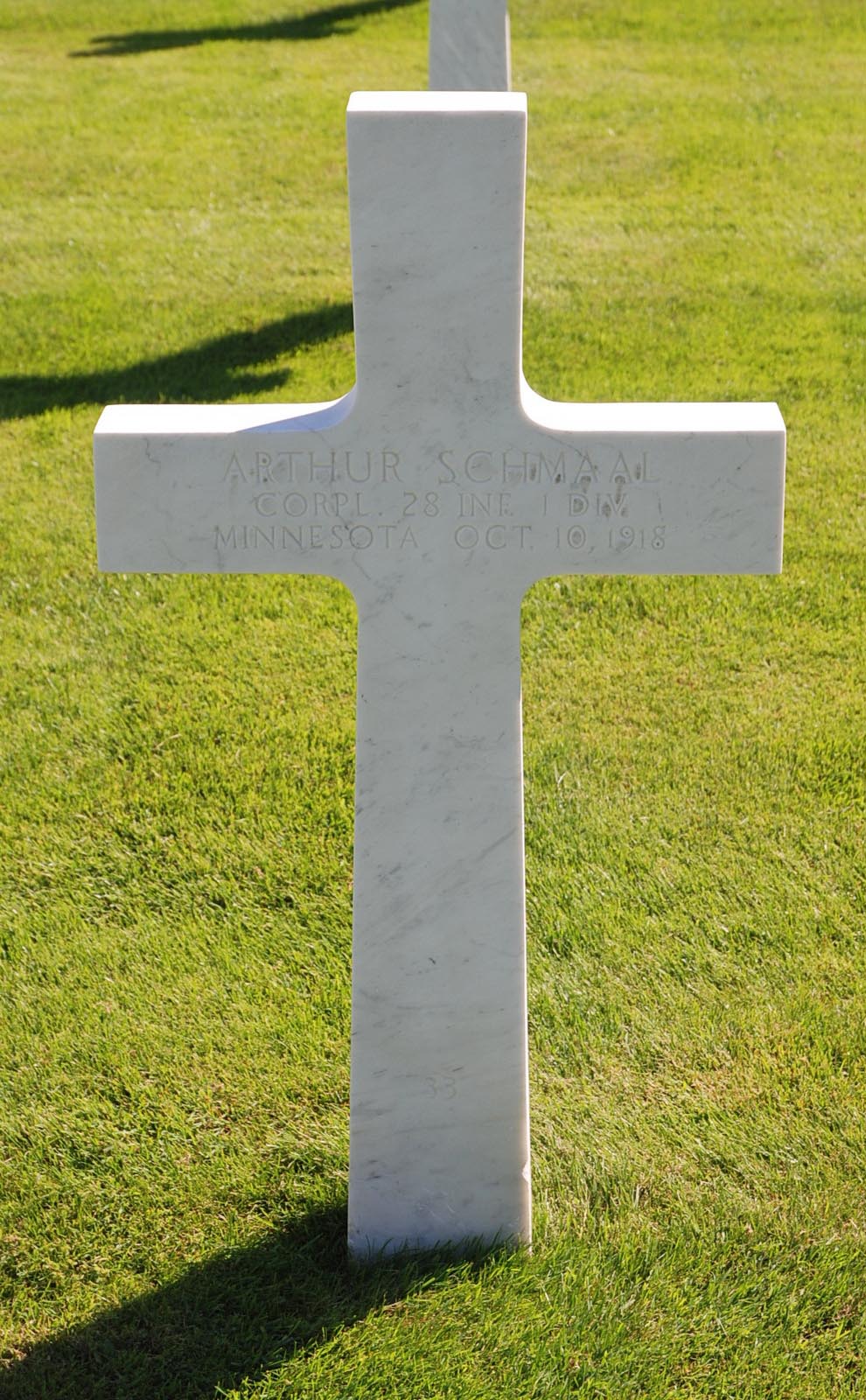 When Arthur Schmaal was born on February 28, 1894, his father, William, was 31 and his mother, Bergitte, was 18. He had two brothers and three sisters. He entered the military service in Minnesota and served in the U.S. Army during World War I as a Corporal in Company M, 28th Infantry Regiment, 1st Infantry Division. He was Killed in Action on October 10, 1918 and is now buried in Meuse-Argonne American Cemetery and Memorial, Romagne-sous-Montfaucon, Departement de la Meuse, Lorraine, France. His name is commemorated on the First Infantry Division monument in Saint-Juvin, France but his surname is inscribed as Schmall.
