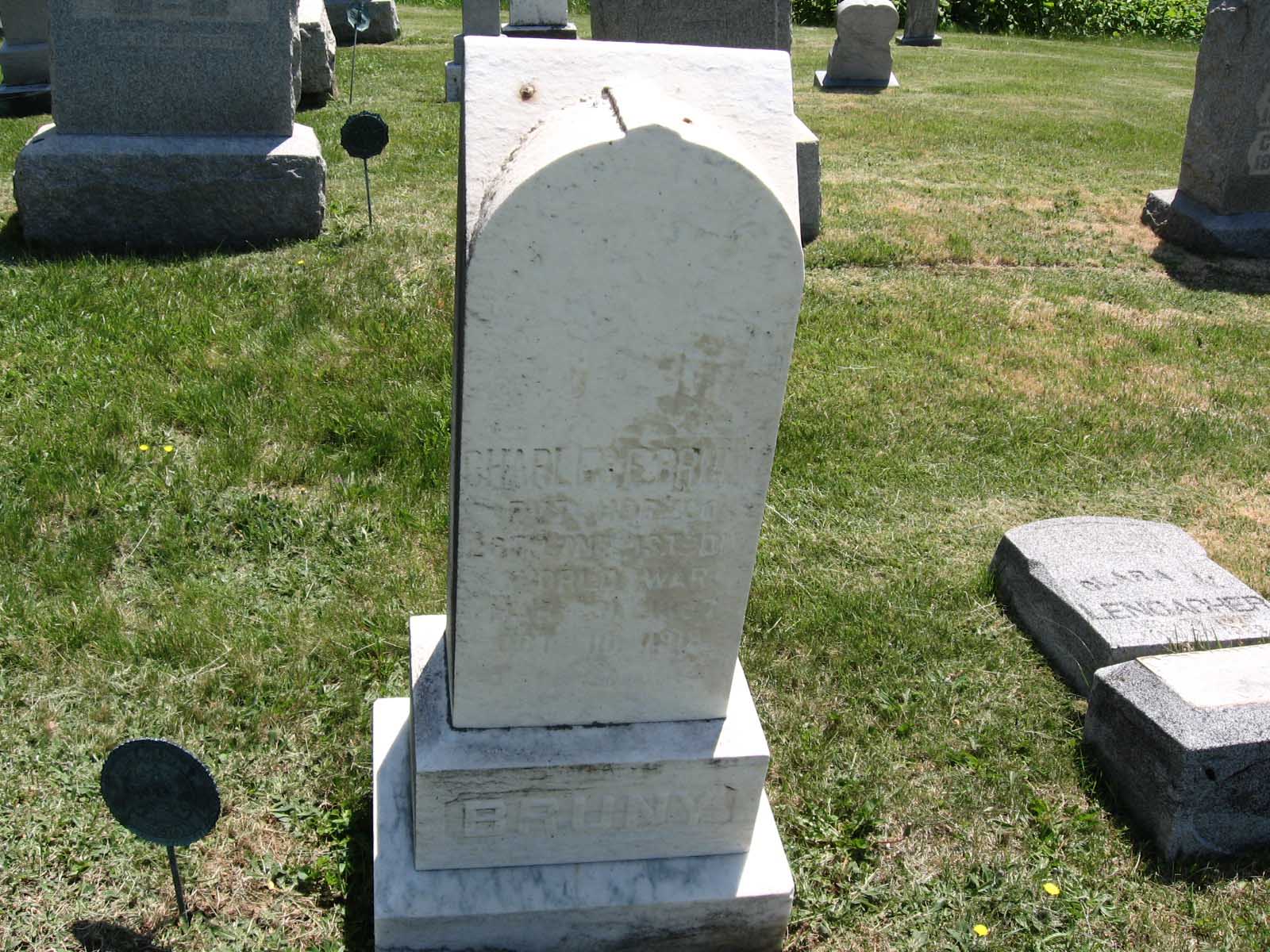 When Charles Edward Bruny was born on March 31, 1887, his father, William, was 27 and his mother, Rosina, was 26. He had five brothers and three sisters. He was drafted in September 1917, and was a member of the Signal Plattoon, and was in the Headquarters Division of the 28th Infantry. On the 5th day of October, 1918, he was wounded while in line of duty in the Argonne Forest, from which he died days later, on the 10th of October, 1918, aged 31 years, 6 months and 5 days. He is now buried in Salem Cemetery, Sardis, Monroe County, Ohio, USA.