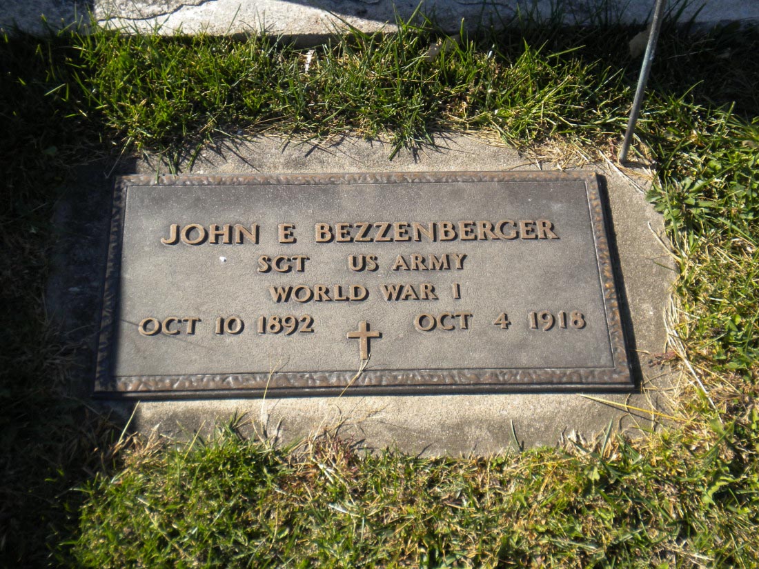 John E. Bezzenberger was born on October 10, 1892. He served in the U.S. Army during World War I as a Sergeant in Machine Gun Company, 28th Infantry Regiment, 1st Infantry Division. He was Killed in Action on October 4, 1918 at the age of 25 and is now buried in Bloomfield IOOF Cemetery, Bloomfield, Davis County, Iowa, USA.