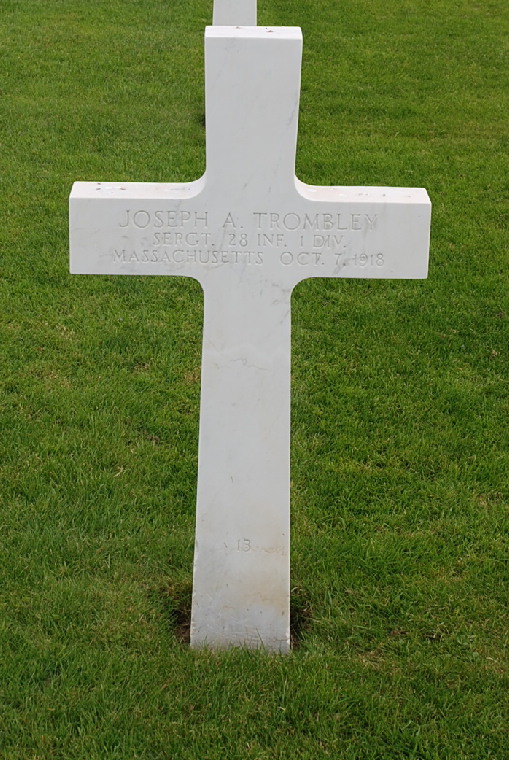 Joseph A. Trombley entered the military service in Massachusetts. He served in the U.S. Army during World War I as a Sergeant in Machine Gun Company, 28th Infantry Regiment, 1st Infantry Division. He was Killed in Action on October 7, 1918 and is now buried in Meuse-Argonne American Cemetery and Memorial, Romagne-sous-Montfaucon, Departement de la Meuse, Lorraine, France.