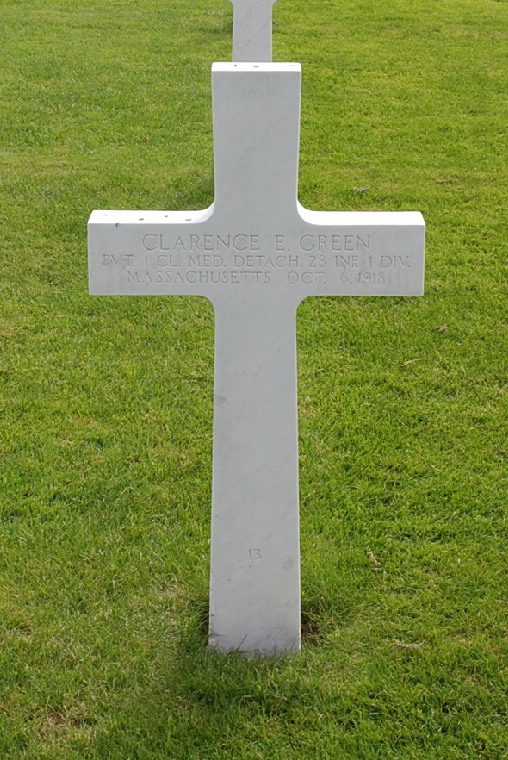 Clarence E. Green entered the military service in Massachusetts. He served in the U.S. Army during World War I as a Private First Class in Medical Detachment Company, 28th Infantry Regiment, 1st Infantry Division. He was Killed in Action on October 6, 1918 and is now buried in Meuse-Argonne American Cemetery and Memorial, Romagne-sous-Montfaucon, Departement de la Meuse, Lorraine, France. His name is commemorated on the First Infantry Division monument in Saint-Juvin, France and ranked as a Private.