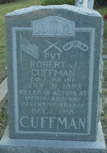 Robert J. Cuffman was born on July 31, 1893. He served in the U.S. Army during World War I as a Private in Supply Company, 28th Infantry Regiment, 1st Infantry Division. He was Killed in Action on October 1, 1918 at Meuse-Argonne Offensive in France at the age of 25 and is now buried in Allen Cemetery, Allen, Collin County, Texas, USA. His name is commemorated on the First Infantry Division monument in Saint-Juvin, France but his name's middle initial is inscribed as G.