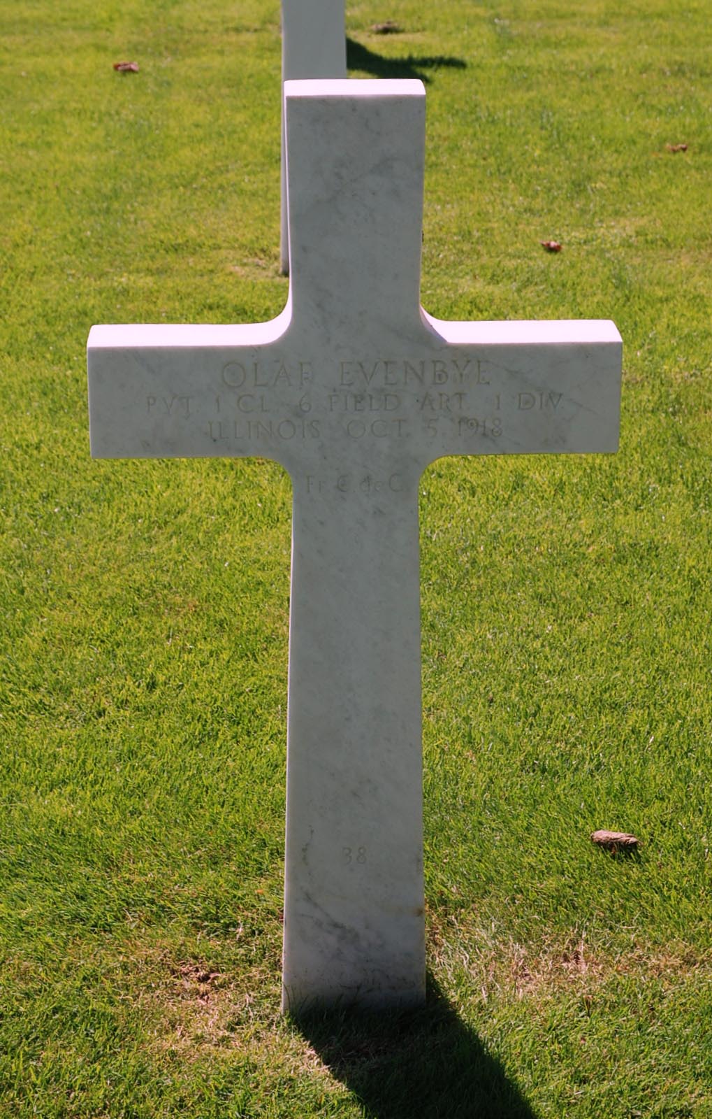 Olaf Evenbye entered the military service in Illinois. He served in the U.S. Army during World War I as a Private First Class in Battery D, 6th Field Artillery Regiment, 1st Division. He was Killed in Action on October 5, 1918 and is now buried in Meuse-Argonne American Cemetery and Memorial, Romagne-sous-Montfaucon, Departement de la Meuse, Lorraine, France.