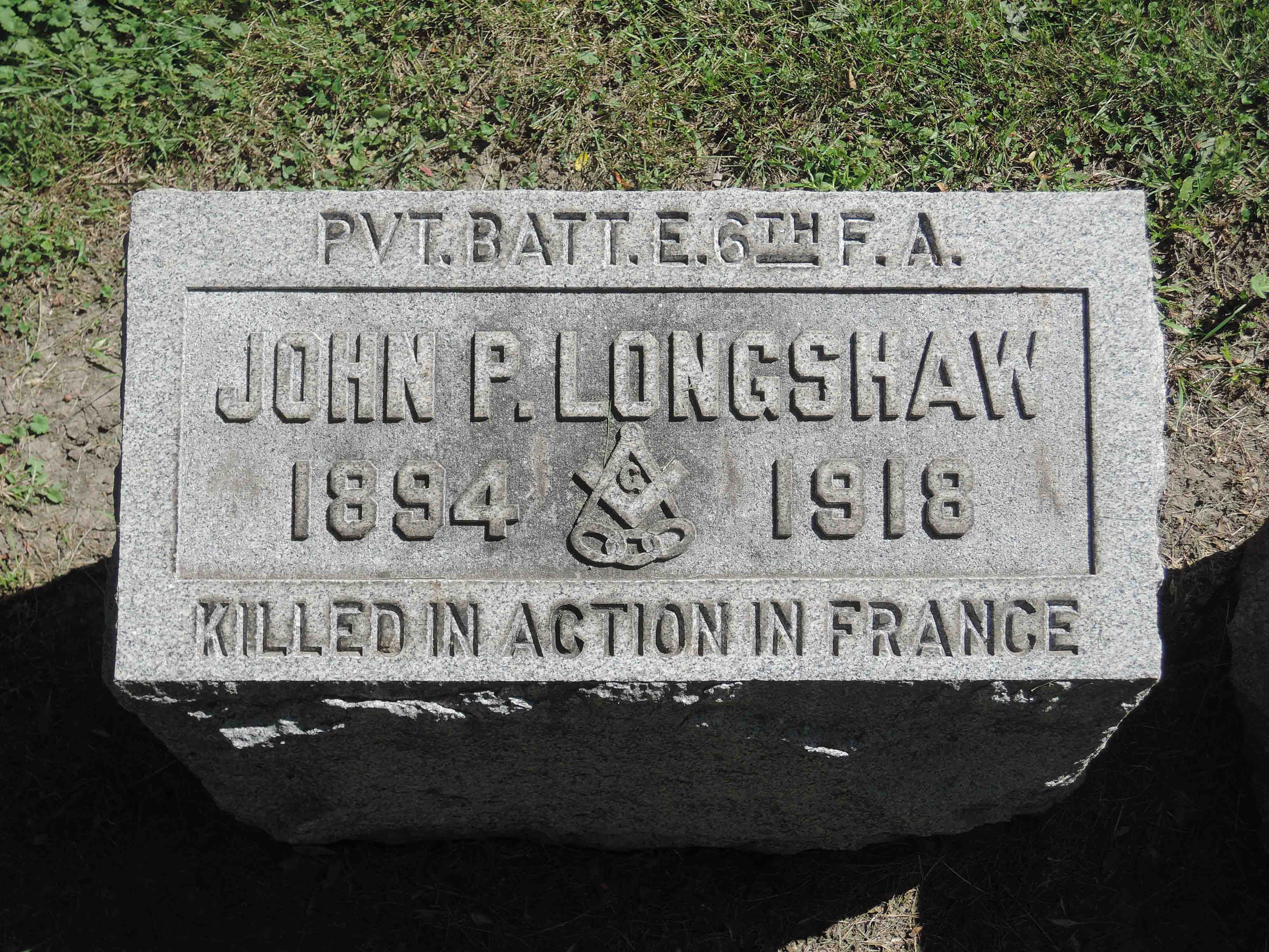 John Proctor Longshaw served in the U.S. Army during World War I as a Private in Battery E, 6th Field Artillery Regiment, 1st Division. He was Killed in Action on October 5, 1918 and is now buried in Forest Home Cemetery, Forest Park, Cook County, Illinois, USA.