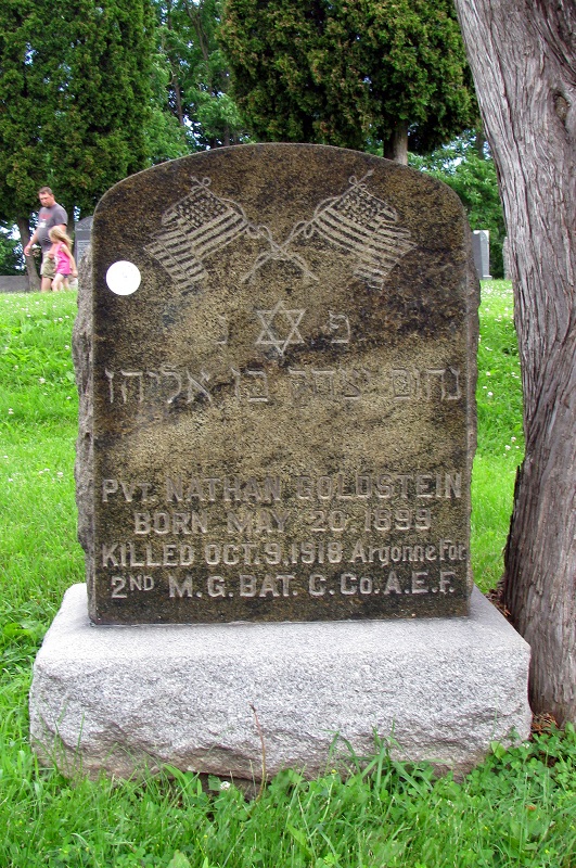 Nathan Goldstein was born on May 20, 1899. He served in the U.S. Army during World War I as a Private in Company C, 2nd Machine Gun Battalion, 1st Infantry Division. He died on October 9, 1918 and is now buried in West Side Hebrew Cemetery, Saint Paul, Ramsey County, Minnesota, USA.