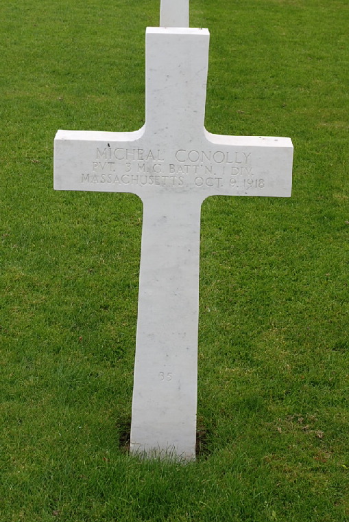 Michael Conolly was born on October 9, 1888 in County Galway, Ireland. Michael emigrated to Massachusetts and lived with a cousin in Lowell, MA. He entered the military service in Massachusetts and was sent overseas to France in July 1918. He served in the U.S. Army during World War I as a Private in Company A, 3rd Machine Gun Battalion, 1st Infantry Division. He stepped on a land mine and died near Sommerance, France on October 9, 1918 at the age of 30. He is now buried in Meuse-Argonne American Cemetery and Memorial, Romagne-sous-Montfaucon, Departement de la Meuse, Lorraine, France. His name is spelled as Micheal in his headstone.