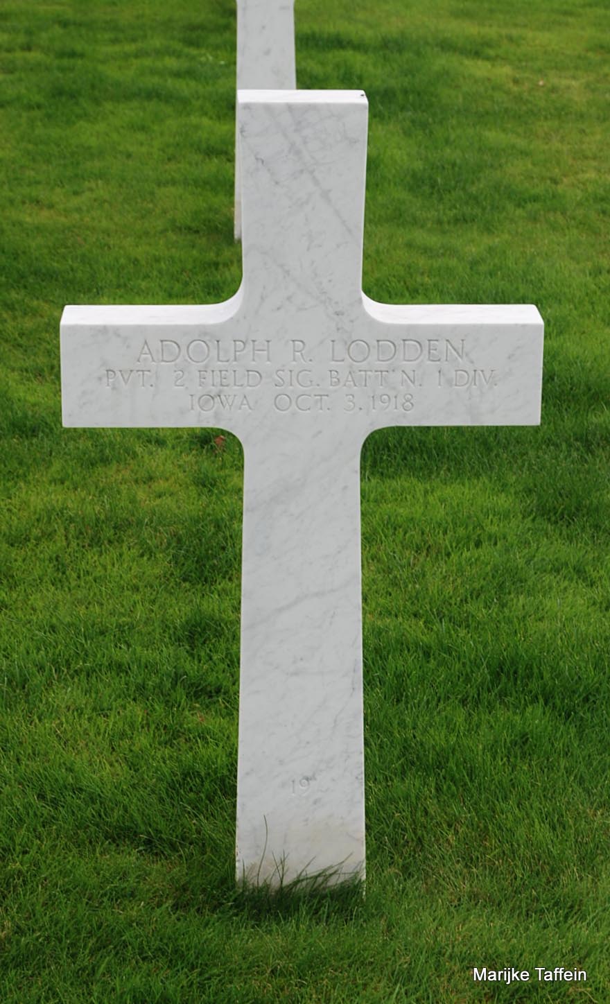 Adolph R. Lodden entered the military service in Iowa. He served in the U.S. Army during World War I as a Private in Company C, 2nd Field Signal Battalion, 1st Infantry Division. He was Killed in Action on October 3, 1918 and is now buried in Meuse-Argonne American Cemetery and Memorial, Romagne-sous-Montfaucon, Departement de la Meuse, Lorraine, France. His name is commemorated on the First Infantry Division monument in Saint-Juvin, France but his surname is inscribed as Loddan and ranked as a Private First Class.