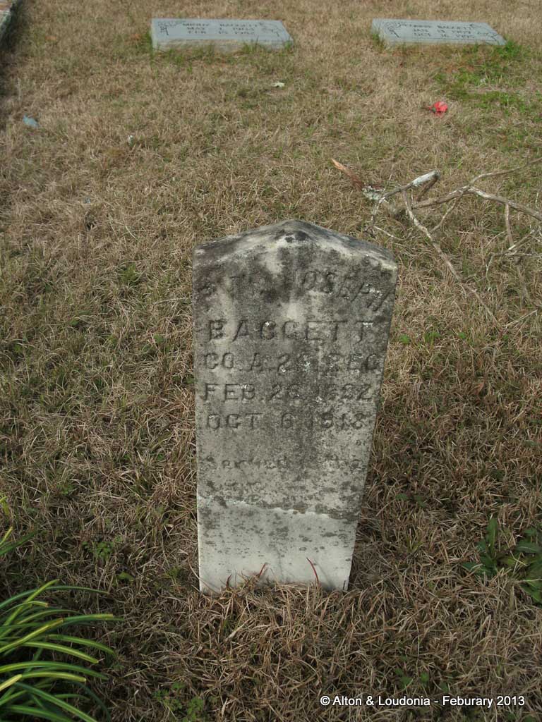 Joseph B. Baggett was born on February 26, 1892. He served in the U.S. Army during World War I as a Private in Company A, 26th Infantry Regiment, 1st Infantry Division. He was Killed in Action on October 6, 1918 and is now buried in Mount Olive Cemetery, Altha, Calhoun County, Florida, USA. His name is commemorated on the First Infantry Division monument in St. Juvin, France but his surname is inscribed as Badgitt.