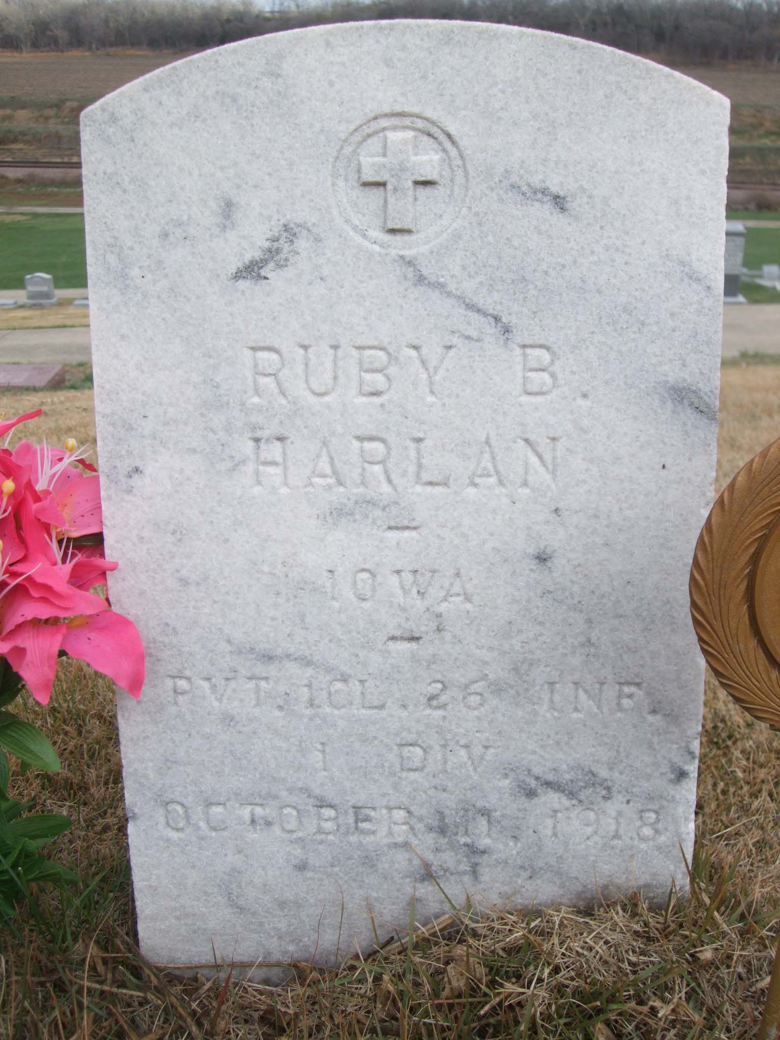 When Ruby B. Harlan was born on January 11, 1892, in Logan, Iowa, his father, William, was 24 and his mother, Lillie, was 26. He served in the U.S. Army during World War I as a Private First Class in Company F, 26th Infantry Regiment, 1st Infantry Division. He was Killed in Action on October 11, 1918 in France at the age of 27 and is now buried in Logan Cemetery, Logan, Harrison County, Iowa, USA. His name is commemorated on the First Infantry Division monument in St. Juvin, France and ranked as a Private.