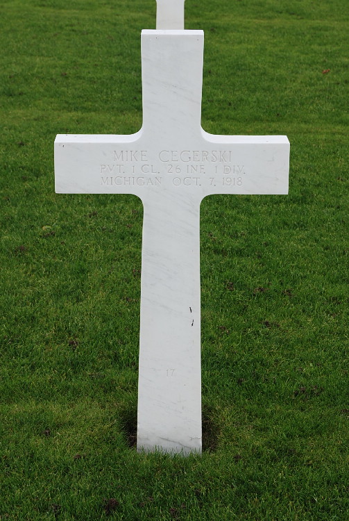 Mike Cegerski entered the military service in Michigan. He served in the U.S. Army during World War I as a Private First Class in Company L, 26th Infantry Regiment, 1st Infantry Division. He was Killed in Action on October 7, 1918 and is now buried in Meuse-Argonne American Cemetery and Memorial, Romagne-sous-Montfaucon, Departement de la Meuse, Lorraine, France. His name is commemorated on the First Infantry Division monument in Saint-Juvin, France but his surname is inscribed as Cagerski.