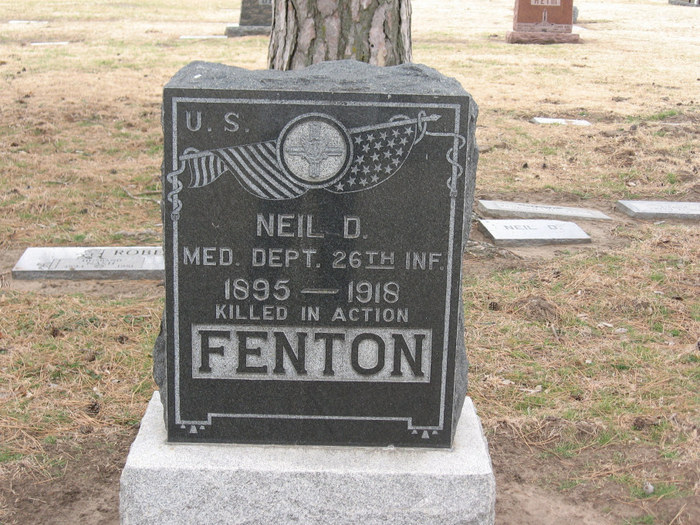 Neil Deforist Fenton was born in January 1896 in Nebraska, the son of Mrs.Emma and Clarence. He had three brothers and two sisters. He served in the U.S. Army during World War I as a Corporal in Medical Detachment Company, 26th Infantry Regiment, 1st Infantry Division. He was Killed in Action on October 9, 1918 in France at the age of 23 and is now buried in American Cemetery, Romange, in the Argonne, France. He also has a cenotaph located in Fairlawn Burial Park, Hutchinson, Reno County, Kansas, USA. His name is commemorated on the First Infantry Division monument in St. Juvin, France but his first name's initial is inscribed as M.