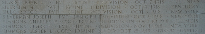 Joseph Silverman entered the military service in New York. He served in the U.S. Army during World War I as a Private in Company D, 3rd Machine Gun Battalion, 1st Infantry Division. He was Killed in Action but declared "Missing" on October 9, 1918 and is memorialized on Tablets of the Missing, Meuse-Argonne American Cemetery and Memorial, Romagne-sous-Montfaucon, Departement de la Meuse, Lorraine, France.