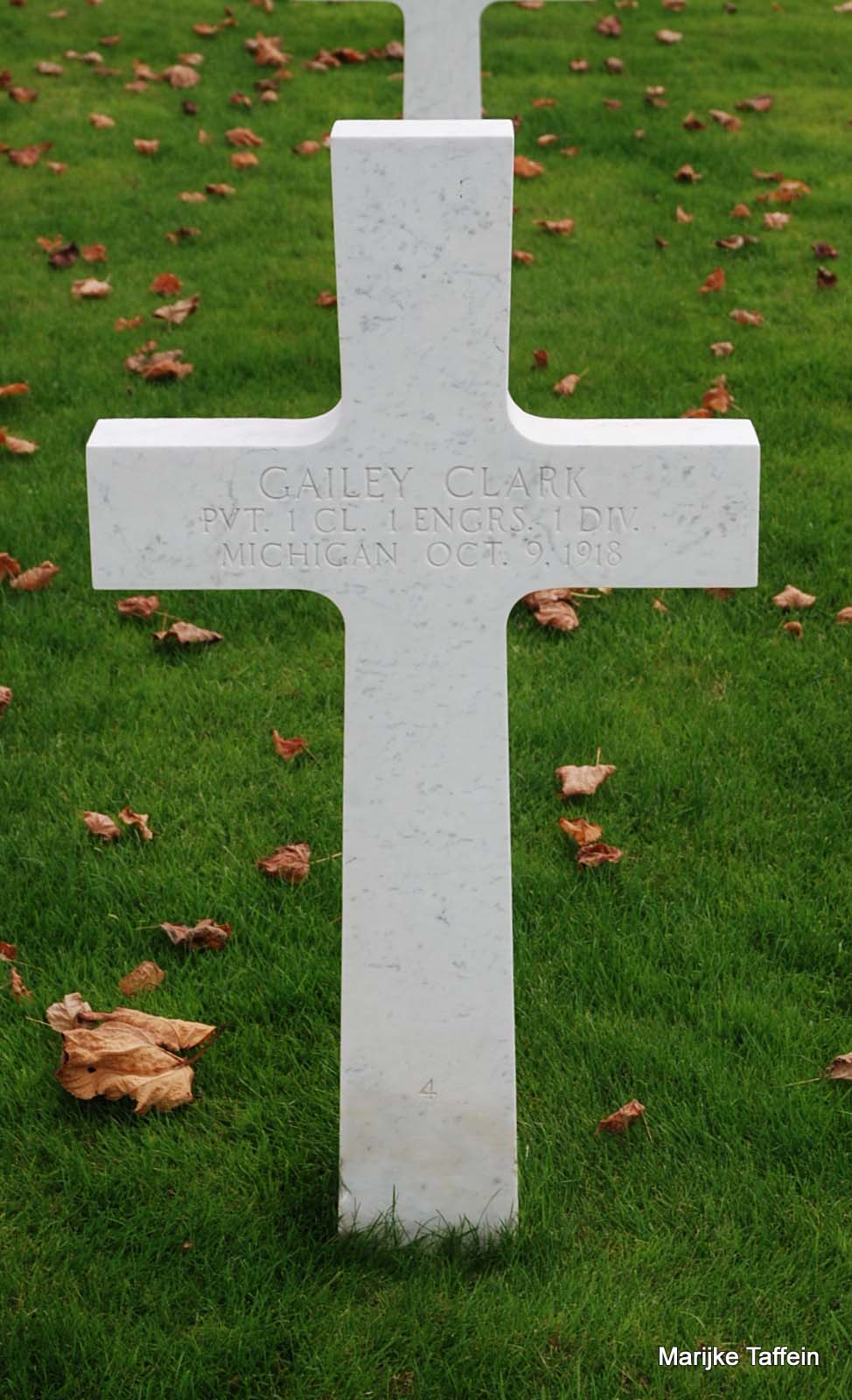When Gailey Clark was born on May 20, 1890, in Michigan, his father, David, was 34 and his mother, Mary, was 26. He had three brothers and four sisters. He served in the U.S. Army during World War I as a Private First Class in Company C, 1st Engineer Combat Battalion, 1st Infantry Division. He was Killed in Action on October 9, 1918 and is now buried in Meuse-Argonne American Cemetery and Memorial, Romagne-sous-Montfaucon, Departement de la Meuse, Lorraine, France.