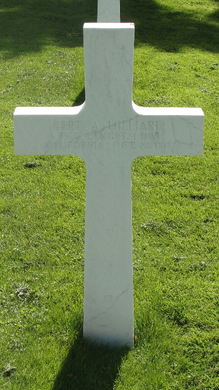 Bert A. Hilliard entered the military service in California. He served in the U.S. Army during World War I as a Private in Company C, 1st Engineer Combat Battalion, 1st Infantry Division. He was Killed in Action on October 10, 1918 and is now buried in Meuse-Argonne American Cemetery and Memorial, Romagne-sous-Montfaucon, Departement de la Meuse, Lorraine, France.