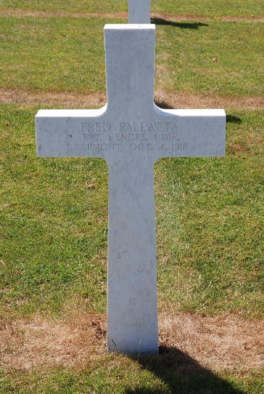 Fred Pallatta entered the military service in Vermont. He served in the U.S. Army during World War I as a Private in Company E, 1st Engineer Combat Battalion, 1st Infantry Division. He died on October 4, 1918 and is now buried in Meuse-Argonne American Cemetery and Memorial, Romagne-sous-Montfaucon, Departement de la Meuse, Lorraine, France.