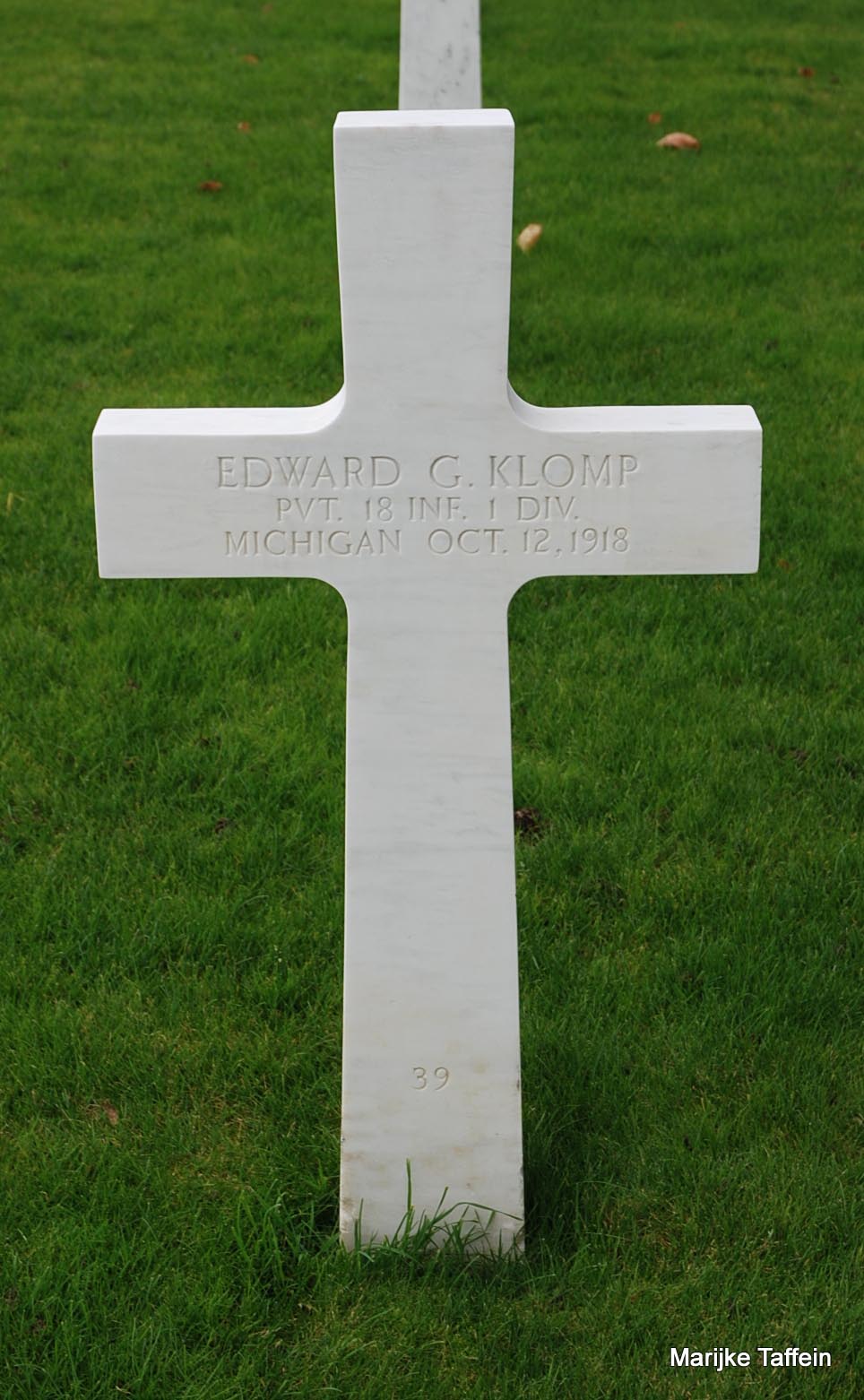 Edward G. Klomp was born on August 15, 1894. He was the son of Gerrit Klomp and Riekje Franken Klomp. He served in the U.S. Army during World War I as a Private in Company D, 18th Infantry Regiment, 1st Infantry Division. He died from his wounds received in battle on October 12, 1918 and is now buried in Meuse-Argonne American Cemetery and Memorial, Romagne-sous-Montfaucon, Departement de la Meuse, Lorraine, France. He also has a cenotaph located in Clark Cemetery, Newaygo County, Michigan, USA. His name is commemorated on the First Infantry Division monument in St. Juvin, France under the MISSING IN ACTION section.