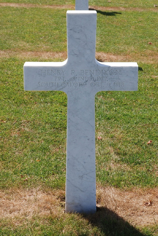 Henry R. Bendixon entered the military service in South Dakota. He served in the U.S. Army during World War I as a Private in Company E, 18th Infantry Regiment, 1st Infantry Division. He was Killed in Action on October 9, 1918 and is now buried in Meuse-Argonne American Cemetery and Memorial, Romagne-sous-Montfaucon, Departement de la Meuse, Lorraine, France. His name is commemorated on the First Infantry Division monument in St. Juvin, France under the MISSING IN ACTION section.
