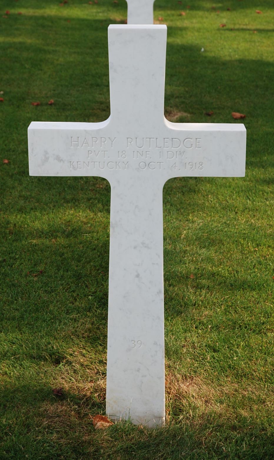 Harry Rutledge entered the military service in Kentucky. He served in the U.S. Army during World War I as a Private in Company G, 18th Infantry Regiment, 1st Infantry Division. He was Killed in Action on October 4, 1918 and is now buried in Meuse-Argonne American Cemetery and Memorial, Romagne-sous-Montfaucon, Departement de la Meuse, Lorraine, France. His name is commemorated on the First Infantry Division monument in St. Juvin, France under the MISSING IN ACTION section.
