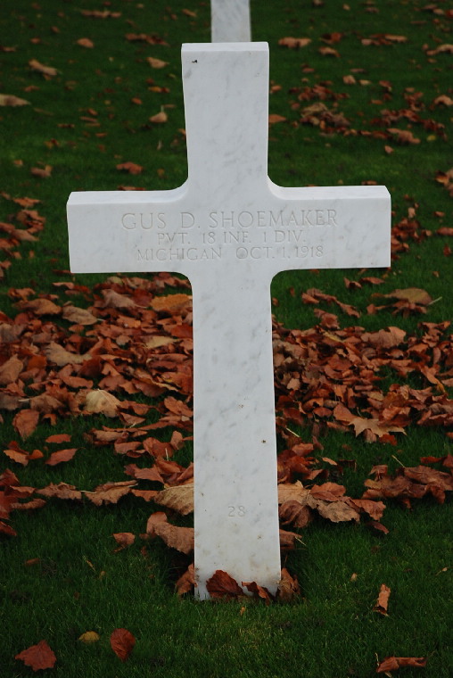 Gus D. Shoemaker entered the military service in Michigan. He served in the U.S. Army during World War I as a Private in Company K, 18th Infantry Regiment, 1st Infantry Division. He was Killed in Action on October 1, 1918 and is now buried in Meuse-Argonne American Cemetery and Memorial, Romagne-sous-Montfaucon, Departement de la Meuse, Lorraine, France. His name is commemorated on the First Infantry Division monument in St. Juvin, France but his name's middle initial is inscribed as E.