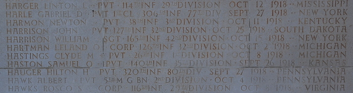 Clyde M. Hastings entered the military service in Michigan. He served in the U.S. Army during World War I as a Private in Company C, 26th Infantry Regiment, 1st Infantry Division. He was Killed in Action but declared "Missing" on October 8, 1918 and is memorialized on Tablets of the Missing, Meuse-Argonne American Cemetery and Memorial, Romagne-sous-Montfaucon, Departement de la Meuse, Lorraine, France.