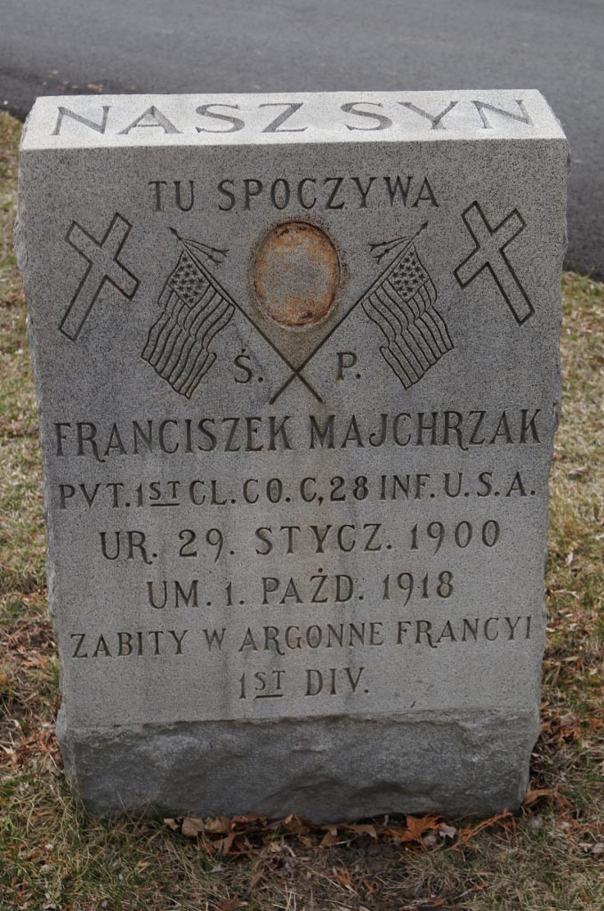Franciszek Majchrzak was born on January 29, 1900. He served in the U.S. Army during World War I as a Private First Class in Company C, 28th Infantry Regiment, 1st Infantry Division. He was Killed in Action on October 1, 1918 in Argonne, France at the age of 18 and is now buried in Saint Adalbert's Cemetery, Milwaukee, Milwaukee County, Wisconsin, USA.
