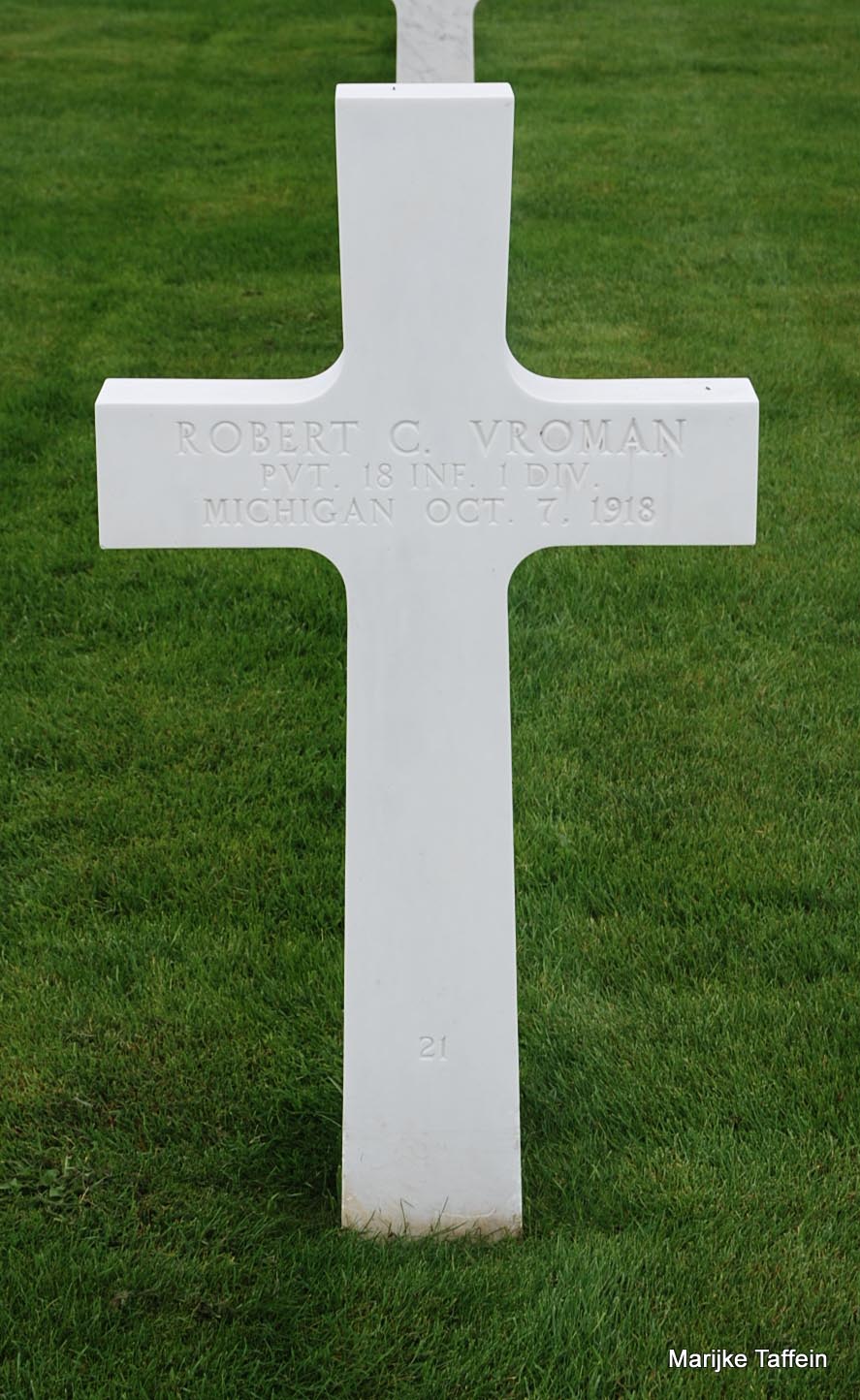 Robert C. Vroman entered the military service in Michigan. He served in the U.S. Army during World War I as a Private in Company G, 18th Infantry Regiment, 1st Infantry Division. He died from his wounds received in battle on October 7, 1918 and is now buried in Meuse-Argonne American Cemetery and Memorial, Romagne-sous-Montfaucon, Departement de la Meuse, Lorraine, France. Other sources tell he's with the 28th Infantry Regiment. His name is commemorated on the First Infantry Division monument in St. Juvin, France under the MISSING IN ACTION section.