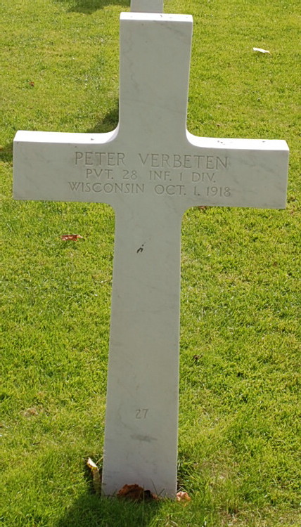 Peter Verbeten entered the military service in Wisconsin. He served in the U.S. Army during World War I as a Private in Company L, 28th Infantry Regiment, 1st Infantry Division. He was Killed in Action on October 1, 1918 and is now buried in Meuse-Argonne American Cemetery and Memorial, Romagne-sous-Montfaucon, Departement de la Meuse, Lorraine, France. His name is commemorated on the First Infantry Division monument in St. Juvin, France under the MISSING IN ACTION section.