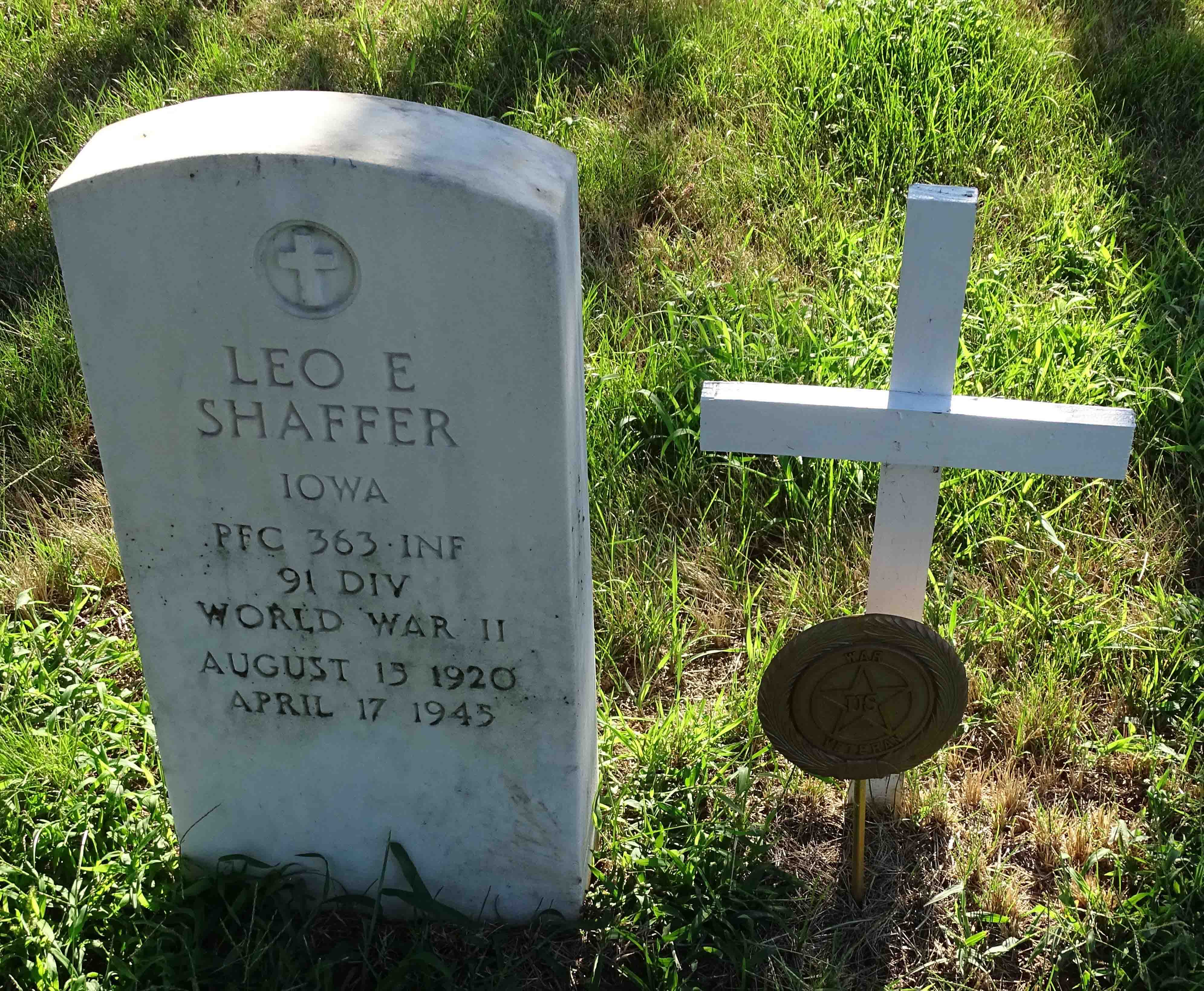 Leo Ellison Shaffer, aged 24, was born on August 15, 1920 in Iowa. He was the son of Burl Benjamin Shaffer and Anna Jane McHugh Shaffer. Leo served in the 363rd Infantry Regiment, 91st Infantry Division as a Private First Class during World War II. He was Killed in Action on April 17, 1945 during the battle in the area of Ponzalla, Italy and is now buried in the Saint Bridget's Cemetery, Magnolia, Harrison County, Iowa, USA.