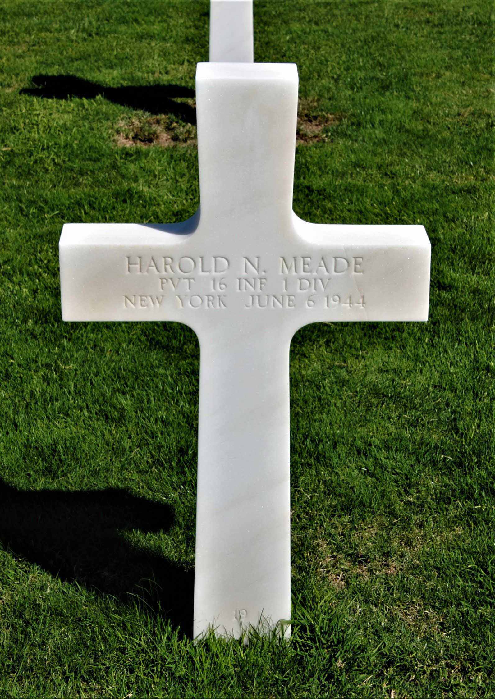 Harold Nicholas Meade was born on January 24, 1925, in Brooklyn, Kings County (Brooklyn), New York. He served in the U.S. Army during World War II as a Private and a combat medic in the 16th Infantry Regiment, 1st Infantry Division. He died on June 6, 1944 during the invasion on Omaha Beach, France and is now buried in Normandy American Cemetery, Colleville-sur-Mer, France.