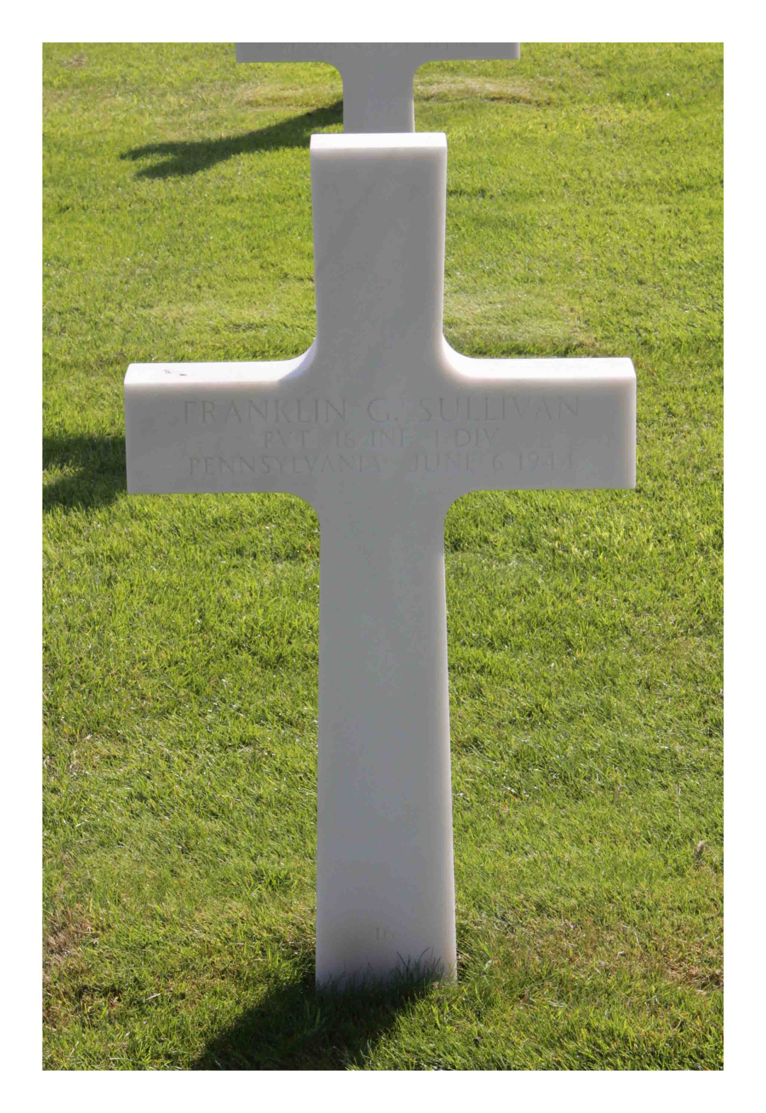 Franklin G. Sullivan entered the military service in Pennsylvania. He served in the U.S. Army during World War II as a Private in the 16th Infantry Regiment, 1st Infantry Division. He died on June 6, 1944 during the invasion on Omaha Beach, France and is now buried in Normandy American Cemetery, Colleville-sur-Mer, France.