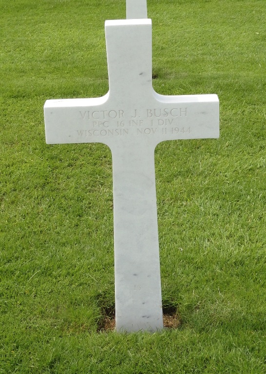 Victor J. Busch was born on February 4, 1923. He was the son of August and Anna Busch. Victor entered the military service in Wisconsin and served in the U.S. Army during World War II as a Private First Class in the 16th Infantry Regiment, 1st Infantry Division. He died on November 11, 1944 and is now buried in Henri-Chapelle American Cemetery, Hombourg, Belgium. He also has a cenotaph located in Saint John's Lutheran Church Cemetery, Pulcifer, Shawano County, Wisconsin, USA.