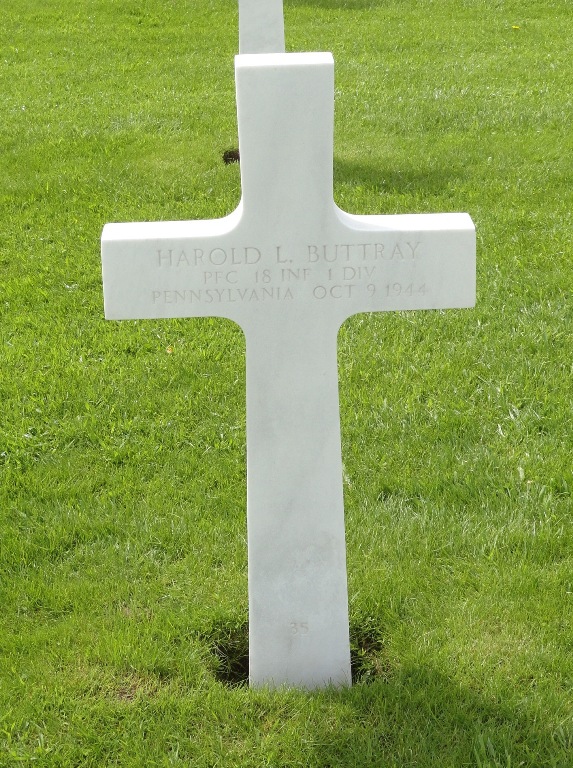 Harold Lloyd Buttray was born on November 17, 1924 in Meadville, Crawford County, Pennsylvania. He served in the U.S. Army during World War II as a Private First Class in the 18th Infantry Regiment, 1st Infantry Division. He died on October 9, 1944 and is now buried in Henri-Chapelle American Cemetery, Hombourg, Belgium. He also has a cenotaph located in Roselawn Memorial Gardens, Meadville, Crawford County, Pennsylvania, USA.