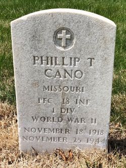 Phillip T. Cano was born on November 18, 1918. He served in the U.S. Army during World War II as a Private First Class in the 18th Infantry Regiment, 1st Infantry Division. He died on November 25, 1944 at the age of 26 and is now buried in Mount Saint Mary's Cemetery, Kansas City, Jackson County, Missouri, USA.