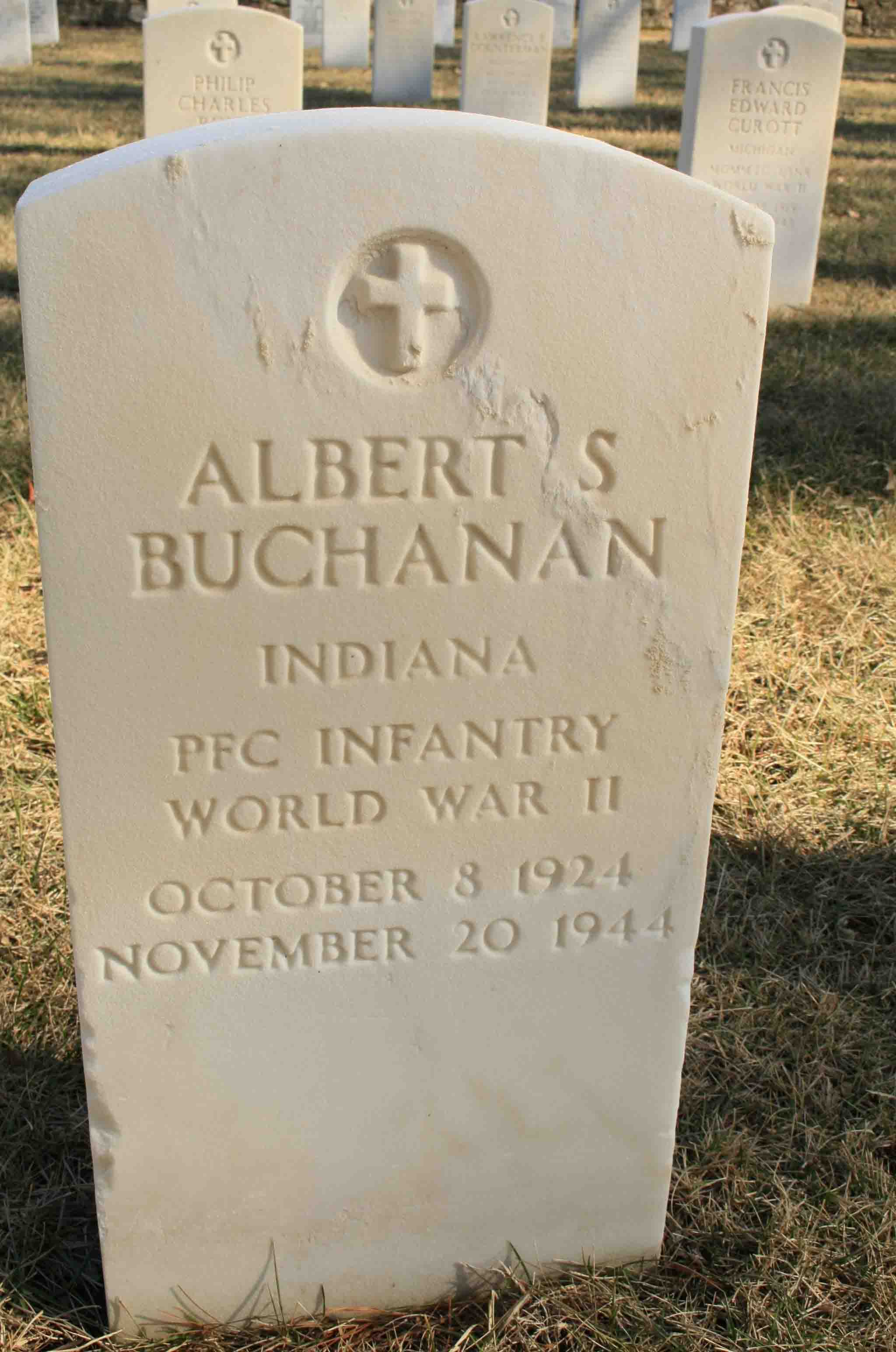 Albert S. Buchanan was born on October 8, 1924. He served in the U.S. Army during World War II as a Private First Class in the 1st Infantry Division. He died on November 20, 1944 at the age of 20 and is now buried in New Albany National Cemetery, New Albany, Floyd County, Indiana, USA.