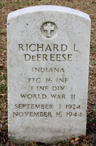 Richard L. DeFreese was born on September 1, 1924. He served in the U.S. Army during World War II as a Private First Class in the 16th Infantry Regiment, 1st Infantry Division. He died on November 16, 1944 at the age of 20 and is now buried in Rice Cemetery, Elkhart, Elkhart County, Indiana, USA.