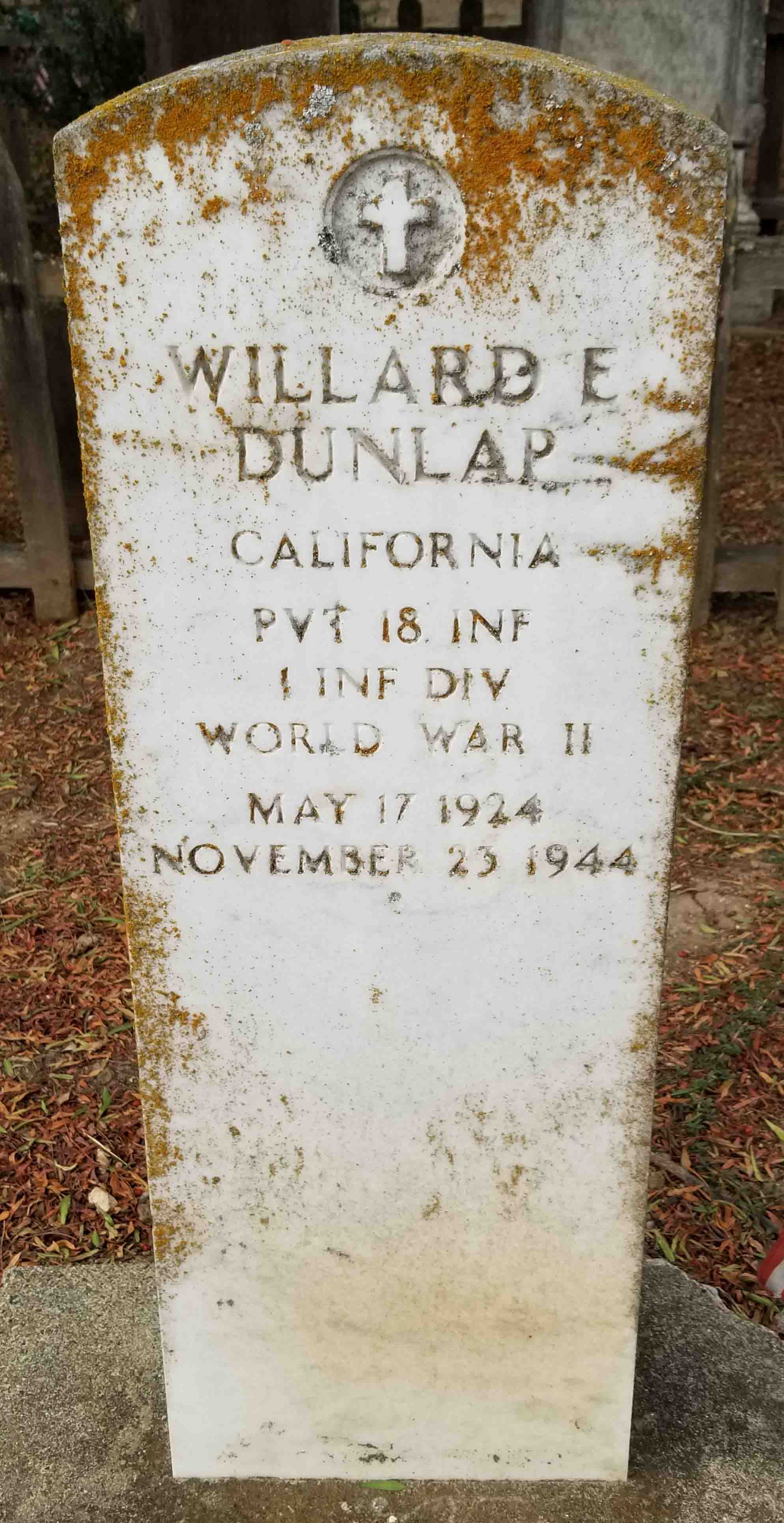 Willard E. Dunlap was born on May 17, 1924. He served in the U.S. Army during World War II as a Private in the 18th Infantry Regiment, 1st Infantry Division. He died on November 23, 1944 at the age of 20 and is now buried in Mission San Juan Bautista Cemetery, San Juan Bautista, San Benito County, California, USA.